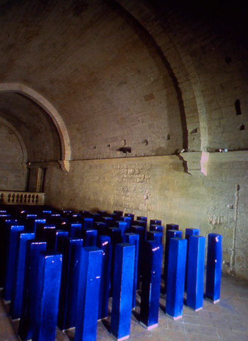 Des pierres blanches, informes, inorganisées, sur lesquelles je pose d’une manière rigoureuse des stèles bleues, alignées en 7 rangées de 7.